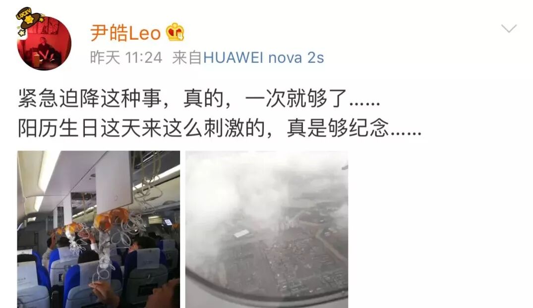 据了解,事发当时,乘务方反复提示,氧气面罩脱落只是单发的机械故障,乘客无需佩戴,更无需恐慌,飞机各项指标符合飞行要求。然而,乘客的担心并没有因此而打消。面对突发的状况,一位名为“尹郜Leo”的微博用户,发出了这样的微博。