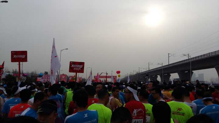 起跑的时候没听到枪声,人太多了,声音盖过了枪声,甚至旁边郑开城际铁路上高铁开过去的声音都盖过去了;